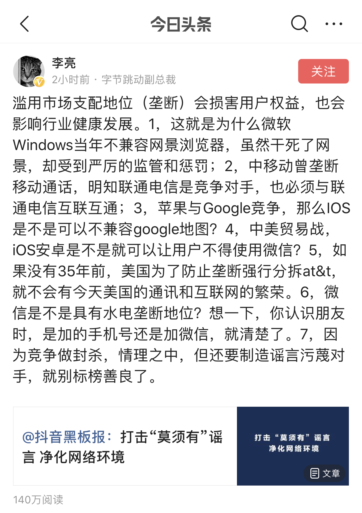 字节跳动副总裁李亮:滥用市场支配地位会损害用户权益。