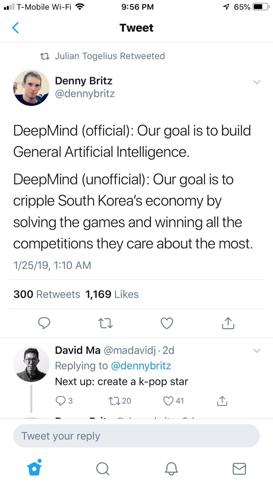 Deepmind的Alphastar打赢人类后……Deepmind(官宣目标):我们的目标是实现AGI(通用人工智能)Deepmind(暗搓搓非官宣目标):我们的目标是用AI把韩国人最爱的游戏/比赛都打赢!然后他们就完了评论:Deepmind下一个目标可能是搞一个“韩星”AIvia Denny Britz