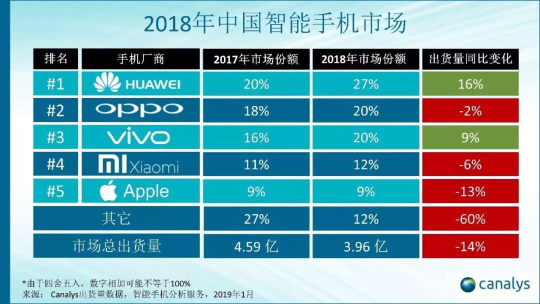 【Canalys:2018年中国智能手机出货量同比大跌14%】市场调研机构Canalys今天公布了中国智能手机市场2018全年出货数据。报告显示,中国市场在2018年经历了有史以来最剧烈的出货衰退,全年出货量为3.96亿台,同比大跌超过14%,总体市场规模拽回到了2014年之前的水平。🤭