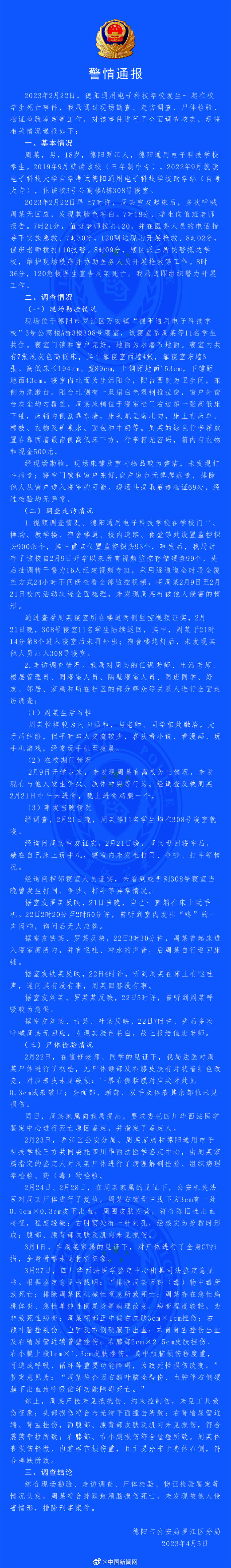四川警方通报学生寝室内死亡。4月5日,四川罗江警方发布警情通报:2月22日,德阳通用电子科技学校发生一起在校学生死亡事件。警方通过现场勘查、走访调查、尸体检验、物证检验鉴定等工作,对该事件进行了全面调查核实,现将相关情况通报如下。