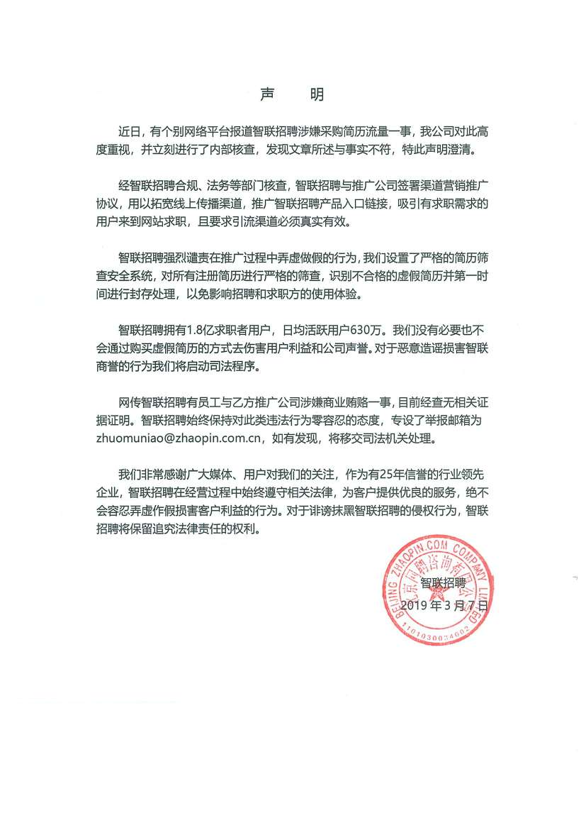 智联对简历造假的回应。供应商与学生纠纷?这怕是说服力还不够。