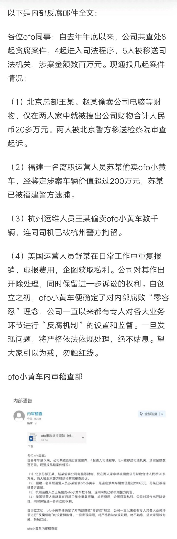 ofo正式发布内部反腐邮件,共查处8起贪腐事件。3月25日,ofo正式发布内部反腐邮件。邮件称,自去年年底以来,公司共查处8起贪腐事件,4起进入司法程序,5人被移送司法机关,涉案金额数百万元。同时,ofo称将对任何腐败行为予以坚决打击,对腐败行为实施零容忍,并鼓励员工举报。