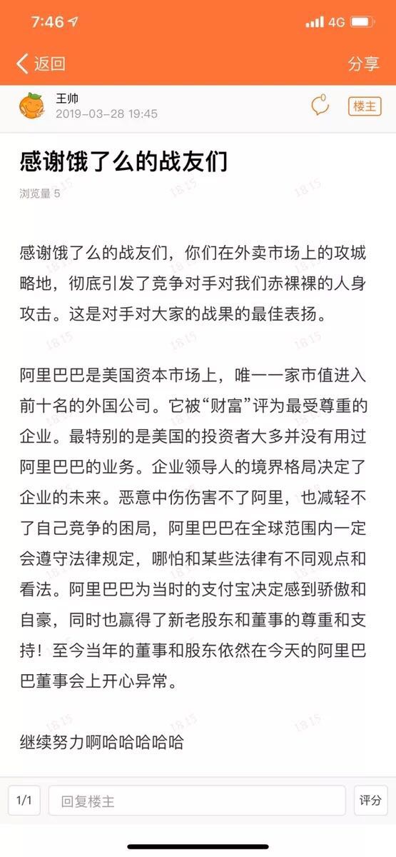 王帅在饿了么内部平台致辞,继续隔空回应王兴:“感谢饿了么战友们,你们在外卖市场上的攻城略地,彻底引发了竞争对手对我们赤裸裸的人身攻击。”