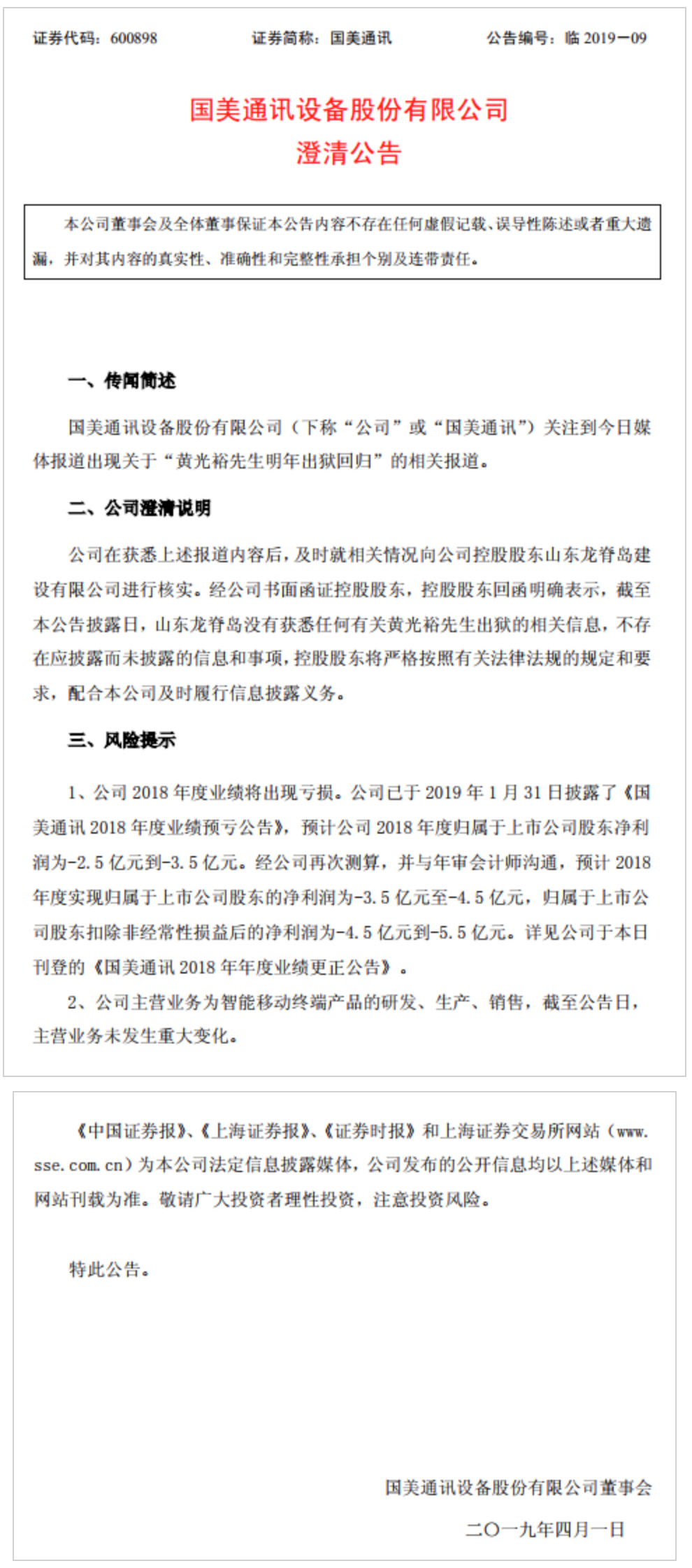 针对“黄光裕明年出狱”一事,国美通讯发布澄清说明称,公司及时就相关情况向公司控股股东山东龙脊岛建设有限公司进行核实。经公司书面函证控股股东,控股股东回函明确表示,截至本公告披露日,山东龙脊岛没有获悉任何有关黄光裕先生出狱的相关信息。