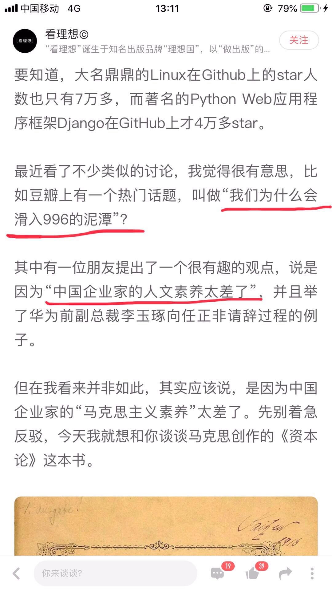 前两天虎嗅发了篇梁文道评论996的文章,引用了一条豆瓣的观点,“中国企业家的人文素养太差”,个人觉得非常贴切。一般人不好理解其中的关联,举个红绿灯例子就明白了,中国企业发展的劲头,和中国人过红绿灯表现出来的行为是相通的,红绿灯本来是警示停、或行的规则,但是两点让中国人选择忽略红绿灯:1、闯红灯(实行996)虽违规,但行人(中国企业家)闯红灯被处罚的概率基本为0,不怕,稳了;2,别人(竞争对手)闯红灯后走到更前,我不闯就(在竞争中)落后吃亏,这两点让中国人必然闯红灯,而这两点,正是人文素养差的体现。