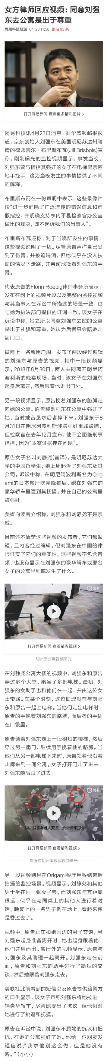 刘强东案女方律师回应视频:同意刘强东去公寓是出于尊重。代表原告的 Florin Roebig 律师事务所表示,发布在网上的视频片段以及完整的监控视频与其当事人在诉讼中所描述的场景一致,也与她为执法部门提供的证词一致。该女子在诉讼中称,她之所以同意刘强东去她的公寓是出于礼貌和尊重,她认为后者只会陪她走到门口。