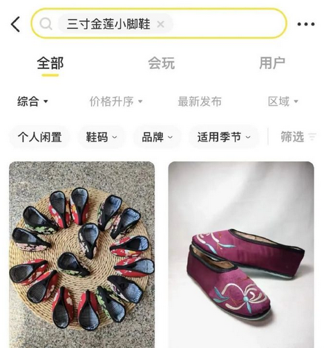 据每日经济新闻,近日,有网友发现在某二手交易平台上,竟有不少店家上架兜售多款“三寸金莲”鞋及其缠足相关商品。其中一家网店兜售的缠足专用袜售价299元/双,还有买家发图展示穿上脚的效果。对此,平台客服回应:“若判定宣扬封建迷信,将做下架处理。”