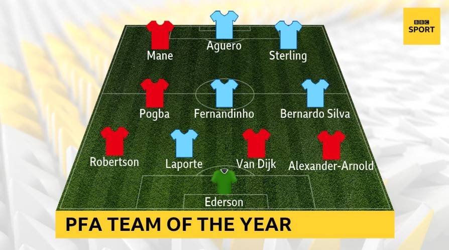 英超PFA年度最佳阵容公布:曼城6人入选,利物浦4人。阵容如下:前锋:马内(利物浦)、阿圭罗(曼城)、斯特林(曼城)中场:博格巴(曼联)、费尔南迪尼奥(曼城)、伯纳德-席尔瓦(曼城)后卫:罗伯逊(利物浦)、拉波尔特(曼城)、范戴克(利物浦)、亚历山大-阿诺德(利物浦)门将:埃德森(曼城)