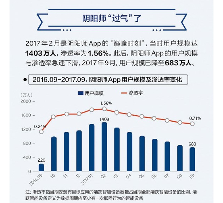 阴阳师“过气”了吗?APP的用户规模从2017年2月的1403万人跌至683万人,不及峰值时的一半。简直是劝退型手游,游戏本身太容易腻了,那股劲过去了,自然热度就下来了。