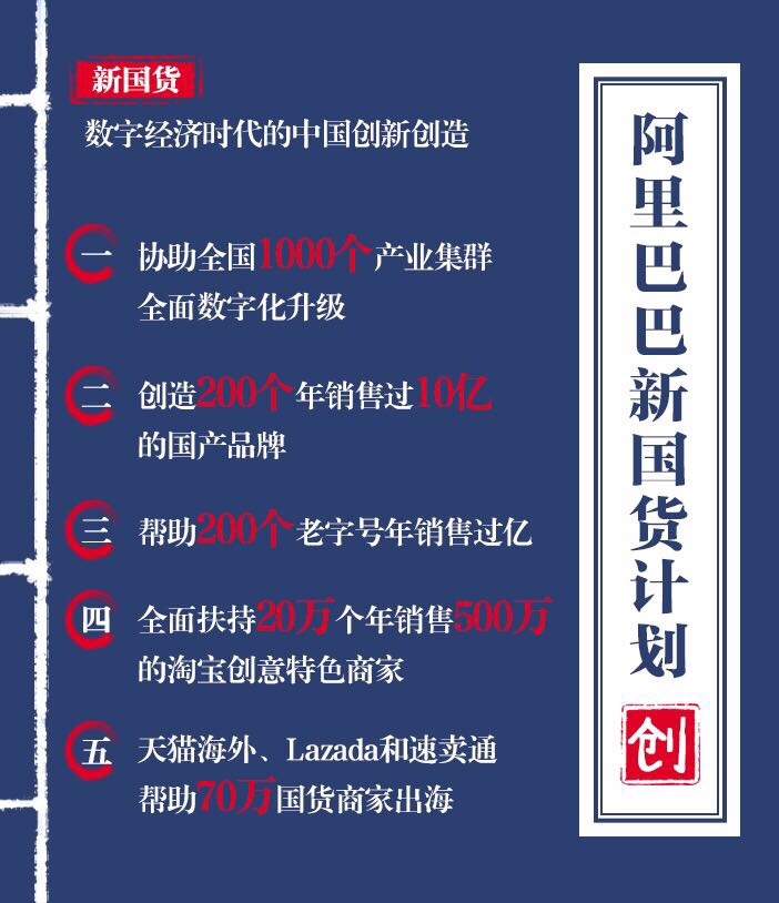 今天阿里发布新国货计划:协助全国1000个产业集群全面数字化升级;创造200个年销售过10亿的国产品牌;帮助200个老字号年销售过亿;全面扶持20万个年销售500万的淘宝创意特色商家;天猫海外、Lazada和速卖通帮助70万国货商家出海。