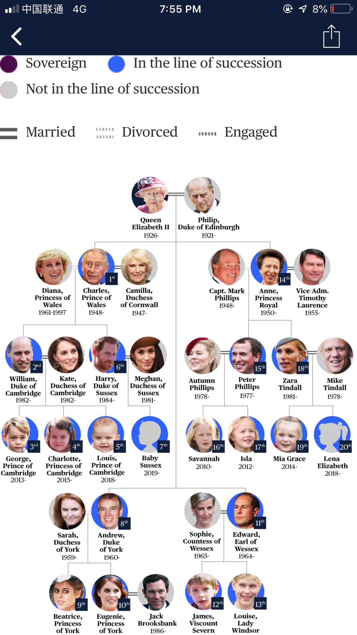 在梅根王妃顺利生下一名男婴后,英国王位目前的继承顺序如图。