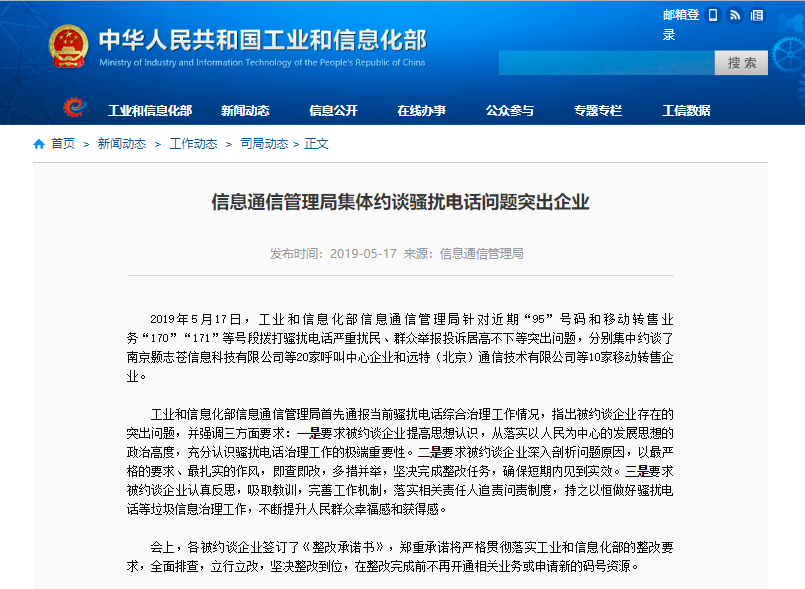5月17日,工信部网站显示,工业和信息化部信息通信管理局针对近期“95”号码和移动转售业务“170”“171”等号段拨打骚扰电话严重扰民、群众举报投诉居高不下等突出问题,分别集中约谈了南京颢志苍信息科技有限公司等20家呼叫中心企业和远特(北京)通信技术有限公司等10家移动转售企业。会上,各被约谈企业签订了《整改承诺书》,郑重承诺将严格贯彻落实工业和信息化部的整改要求,全面排查,立行立改,坚决整改到位,在整改完成前不再开通相关业务或申请新的码号资源。