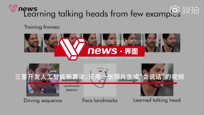 三星开发人工智能新算法 :只用一张图片生成会说话视频。5月24日,三星人工智能中心研究人员展示了一种新算法,可以只用一张图像制作出“会说话”的视频。据悉,研究人员从YouTube上收集了7000个名人图像,从中提取出“标志性”面部特征,用最新算法训练达到这一效果。超现实主义画家萨尔瓦多·达利、女演员玛丽莲梦露、达芬奇画中的蒙娜丽莎等多位名人图像都通过这一算法“动”了起来。(via 界面Vnews)