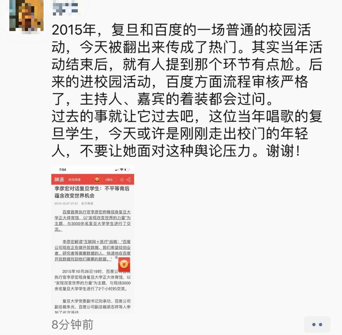 百度回应:不要让当年唱歌的复旦学生面对舆论压力。