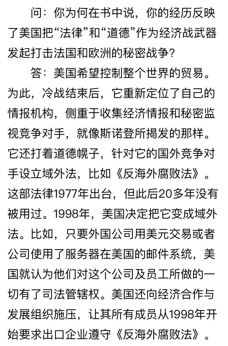 几大央媒都在借法国阿尔斯通高管皮耶鲁齐写的《美国陷阱》一书全力抨击美国海外反腐败法的长臂管辖,问题是这位认罪公司高管的出于自身遭遇的一家之言真有那么权威吗?海外反腐败法真如央媒所论坏事做绝一无是处那么片面吗?宁南山写这篇文章前也不上网查证一下就直接引用这位高管信口开河《海外反腐败法》的管辖权范围?不知道使用美元交易和使用邮件系统的针对对象和前提条件是什么?