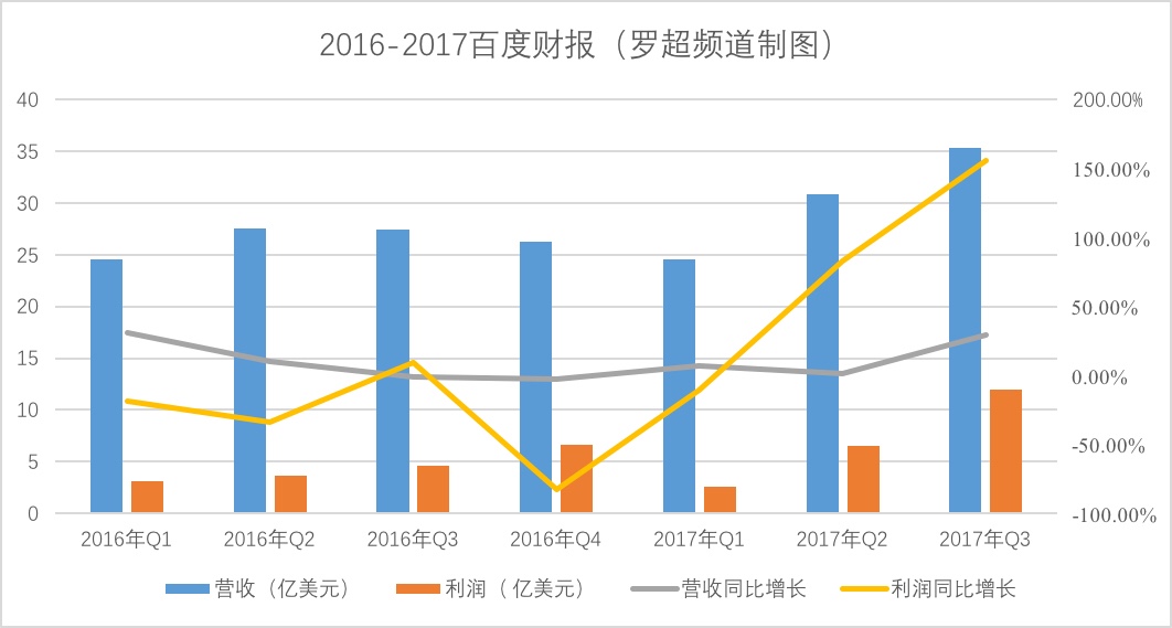 凌晨4:00,美股盘后,百度发布2017年第3季度财报,该季度总营收为235亿元(约合35.3亿美元),同比增长29%;净利润为人民币79亿元(约合12亿美元),同比增长156%。由于营收略低于华尔街分析师预期,百度股价盘后收跌。这说明资本市场对百度三季度预期过高,而不是百度业绩不好:营收增幅是二季度的两倍,净利润增幅156%创下今年新高——一季度净利润下滑10.6%,二季度净利润增长82.9%。从营收和利润这两个指标来看,百度三季度交出了一份漂亮的成绩单。