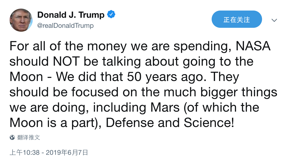 6月7日,特朗普突然发了一条推特,其内容让致力于让美国在2020年代重返月球并建立月球基地的NASA和其他部门的官员们大吃一惊:他们的总统好像要变卦了。