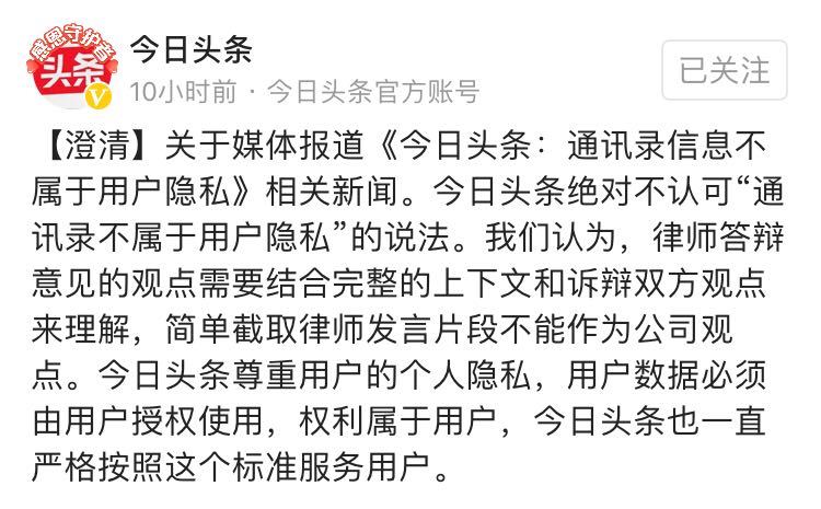 今日头条就“通讯录信息不属于用户隐私”相关报道作出澄清称,今日头条绝对不认可“通讯录不属于用户隐私”的说法。