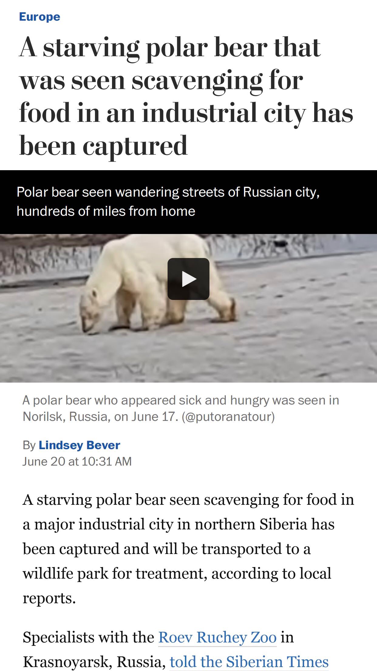 根据当地的专家称,那头在俄罗斯城市Norilsk游荡觅食的北极熊,可能并非是长途跋涉后来到人类城市的,而是被偷猎者在幼崽时盗走后于当地养大的,目的是获得她的皮毛,后因害怕被发现而将她放了出来。