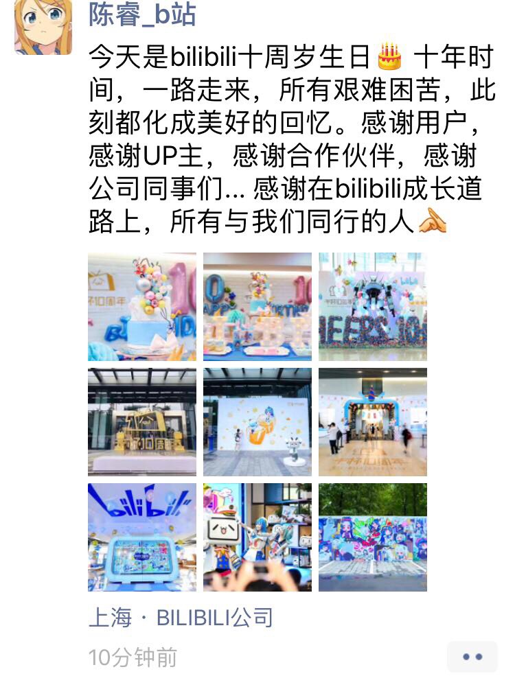 【为B站干杯】在A站刚刚换了CEO 之际,B站董事长陈睿发朋友圈为B站10周岁庆生。干杯,二次元的中二同学们~