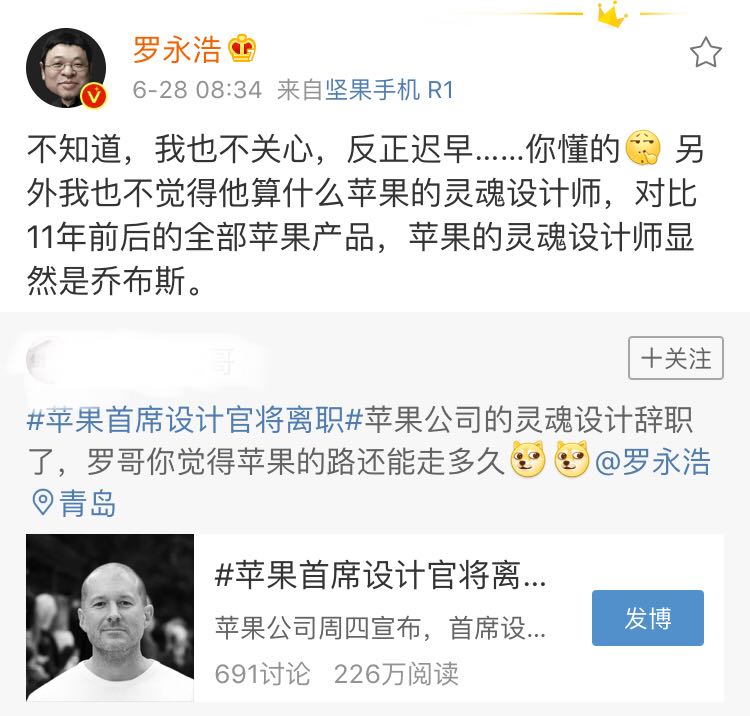 罗永浩谈苹果公司首席设计师艾维离职:苹果的灵魂设计师显然是乔布斯。