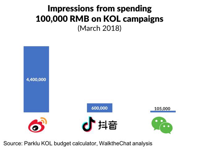 过去,微博在注意力方面相对占优,有一份报告测算了 10w 人民币分别投放微博、抖音和微信之后的曝光效果,认为微博能够带来最大的曝光量(而且远超后两者,见下图)。