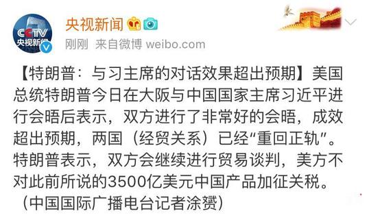 特朗普:与习主席的对话效果超出预期。美国总统特朗普在大阪与中国国家主席习近平进行会晤后表示,双方进行了非常好的会晤,成效超出预期,两国(经贸关系)已经“重回正轨”。特朗普表示,双方会继续进行贸易谈判,美方不对此前所说的3500亿美元中国产品加征关税。