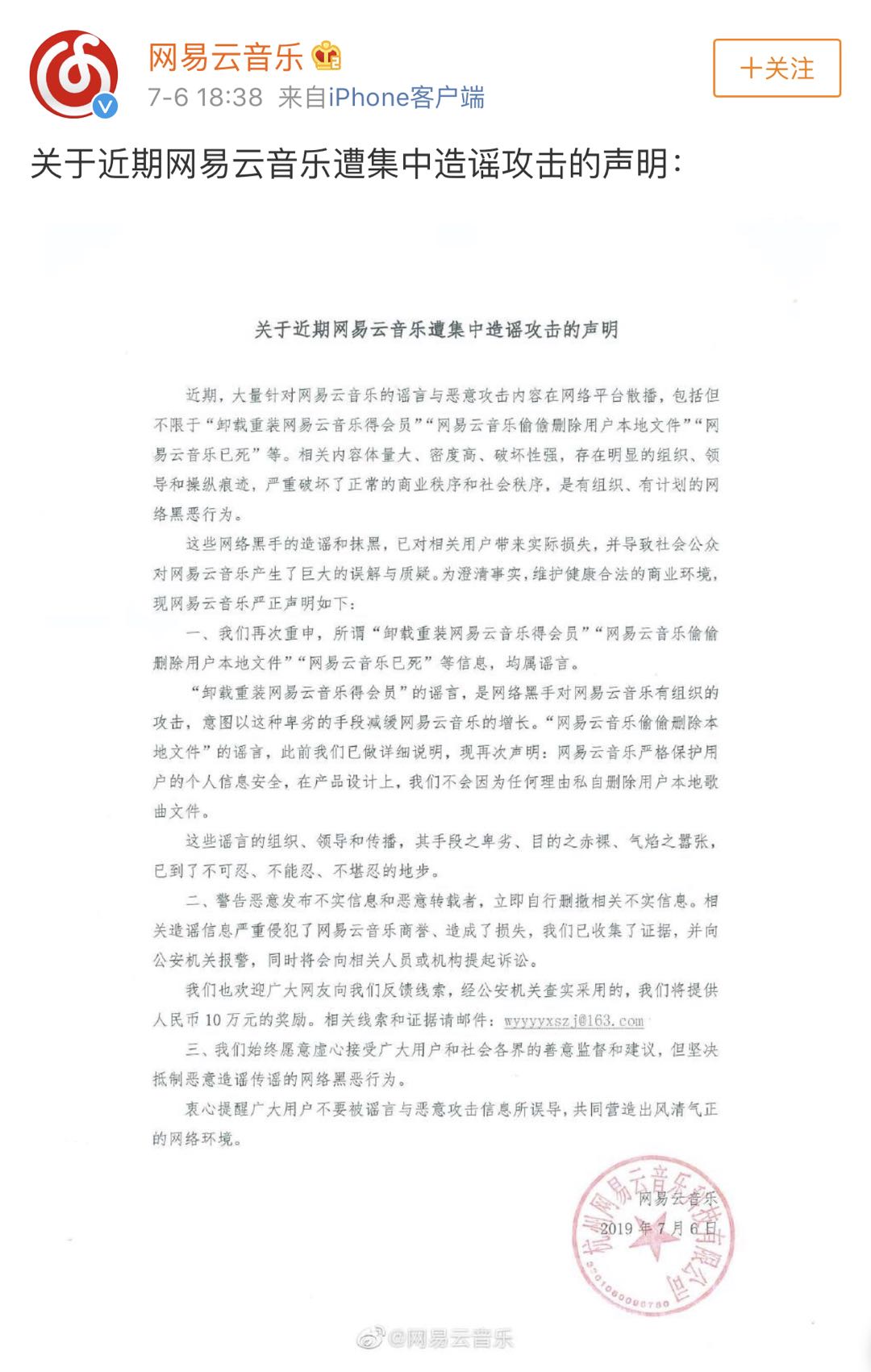 网易云音乐称遭遇集中造谣攻击,已报案并向网友征集线索。7月6日,针对“卸载重装网易云音乐得会员”、“网易云音乐偷偷删除用户本地文件”、“网易云音乐已死”等近期网络内容,网易云音乐在声明中称:相关内容体量大、密度高、破坏性强,存在明显的组织、领导和操纵痕迹,严重破坏了正常的商业秩序和社会秩序,是有组织、有计划的网络黑恶行为。欢迎网友反馈线索,经查实采用的,将提供人民币10万元的奖励。