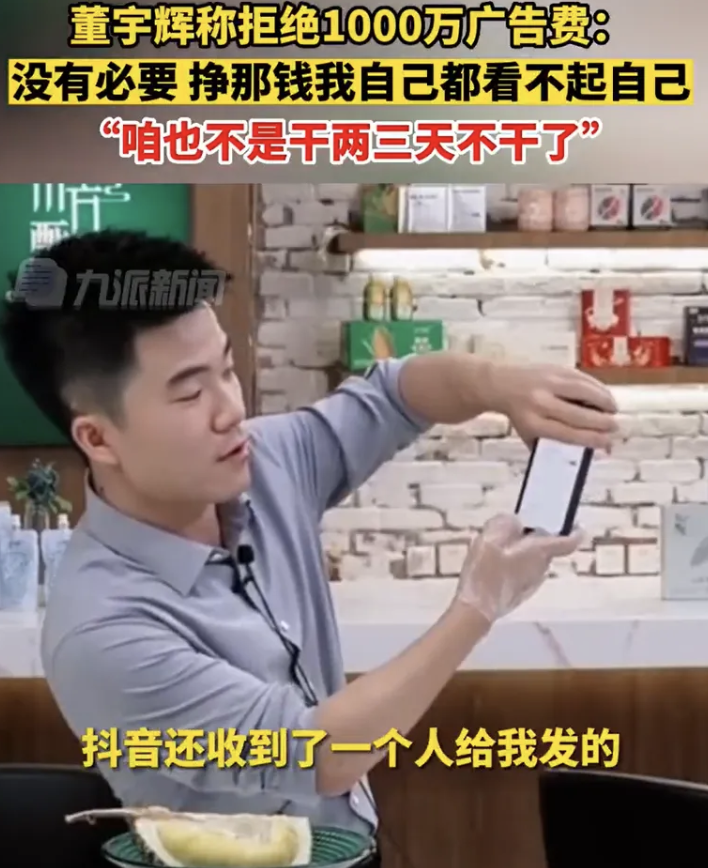 董宇辉自曝拒绝1000万广告费:挣那钱我都看不起我自己,想挣钱早都挣了,早都财富自由了。