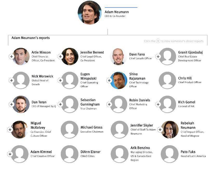 5)Wework 掌舵人 Adam Neumann 至少有 20 个直接下属,且高管队伍里有不少 CEO 的老熟人。比如他的姐夫最近被任命为首席产品官,他的妻子 Rebekah Neumann 担任首席影响官(Chief Impact Officer)。