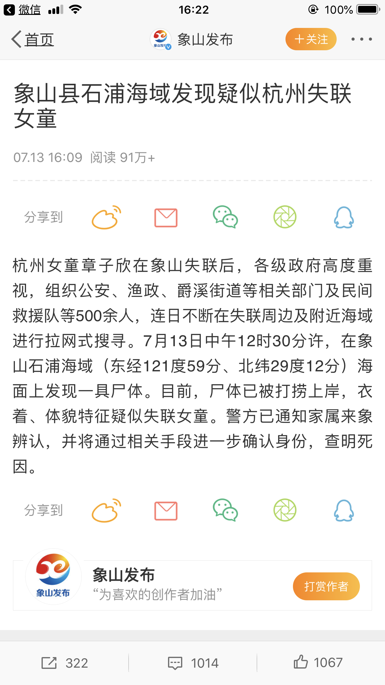 另外,据北青报援引参与救援的一名工作人员的消息称,他们现在还不知道发现的是否为失联女童章子欣,但已接到了警方的收队命令。