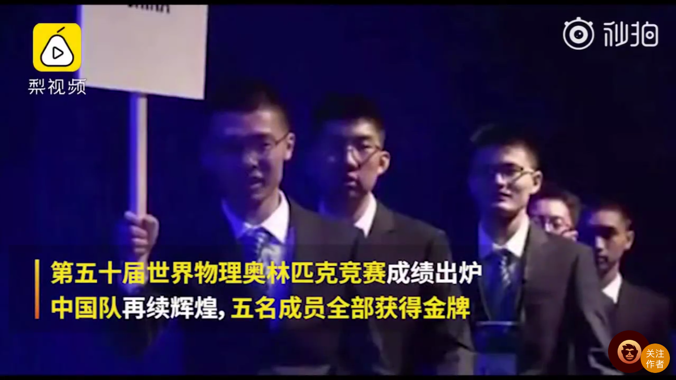 国际物理奥赛中国队包揽第一,五名成员全部夺金。第五十届世界物理奥林匹克竞赛(IPho)成绩出炉:中国队全部5名成员均获得金牌。继去年夺冠后再次获得团体世界第一,包揽所有个人单项第一。人大附中的孙向恺战胜俄罗斯天才少年,获个人理论成绩第一,总成绩第一。