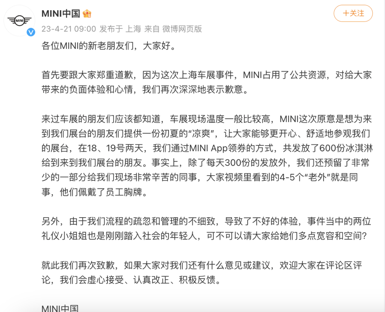 4月20日,有网友爆料,上海车展宝马MINI展台的工作人员发放冰激凌疑区别对待中国和外国访客。该事件引发网友热议,登上微博热搜第一位。随后,MINI中国官方账号发文回应向大家道歉。