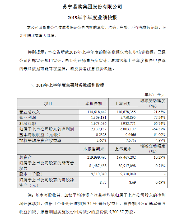 苏宁易购:上半年净利润21.39亿元,同比下降64.37%。苏宁易购发布业绩快报:上半年营业总收入为1346.18亿元,同比增长21.63%;归属于上市公司股东的净利润为21.39亿元,同比下降64.37%,利润总额79.73亿元,同比下降66.74%。苏宁易购称,由于去年同期公司出售了部分阿里巴巴股份实现净利润人民币56.01亿元,受此影响,利润总额、归属于上市公司股东的净利润分别同比下降66.74%、64.37%。