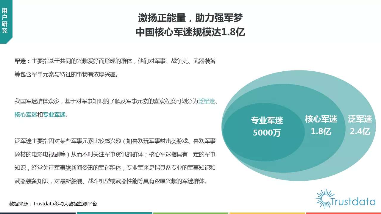 中国2.4亿军迷,这个比科技迷多了差不多十倍。各个信息流平台,军事内容是流量大门类,目前互联网用户画像大体还是"女爱红装,男爱武装"