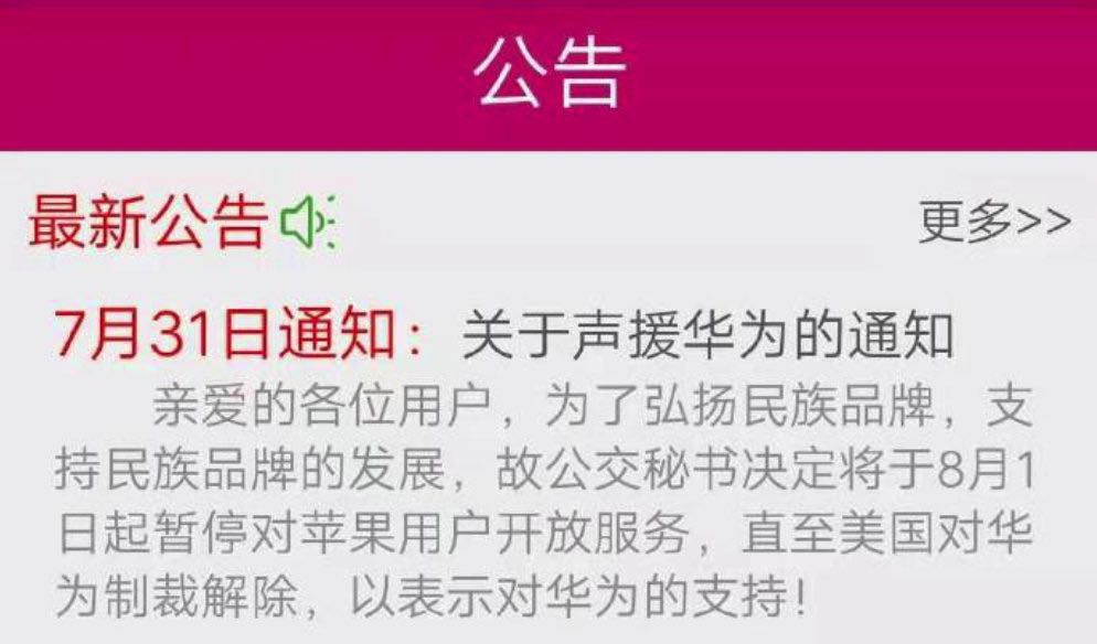 “公交秘书”App声援华为:停止为iPhone提供支持,直到禁令解除。一款名为“公交秘书”的公交出行App发布公告称,为弘扬并支持民族品牌发展,将“声援华为”,停止为苹果iPhone用户开放服务,直到美国禁令解除。目前,iPhone用户仍可下载该应用,但其中功能使用受限。据悉,该应用主要为黑龙江部分城市提供公交车查询服务。App Store上显示,这款软件最新版本是两年以前的......