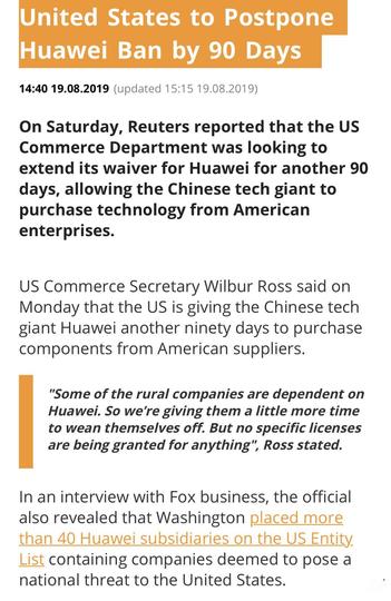 美国将华为临时采购许可证延长90天。据俄罗斯卫星通讯社报道,美国商务部长威尔伯·罗斯表示,该部将允许华为从美国企业购买产品的期限延长90天。他在接受福克斯财经频道采访时还表示,美国将对国家安全构成威胁的40余家华为子公司列入“实体名单”。