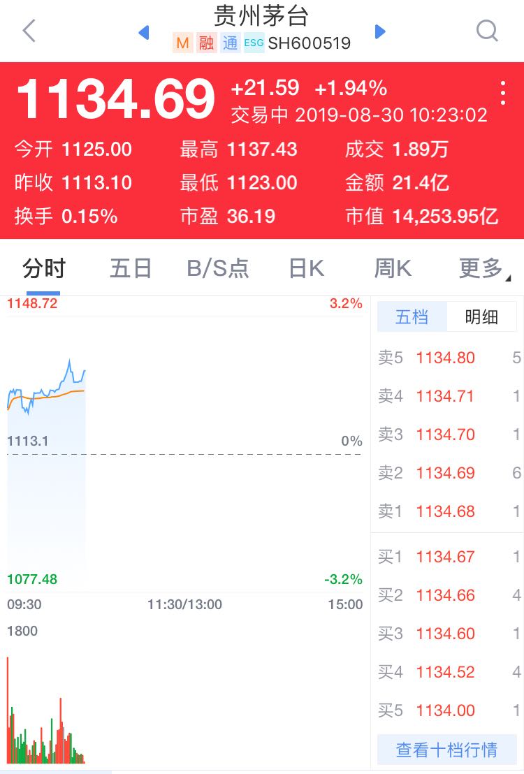8月30日,贵州茅台股价突破1134.69元,创历史新高,涨幅超1.94%。