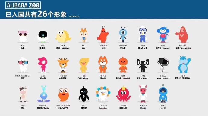 有天猫、飞猪(花名阿飞)、千牛(阿里旺旺商家)、盒马鲜生、闲鱼、蚂蚁金服(花名:支小宝,原名大眼)、阿里鱼、优酷猴(候三迷)、UC松鼠(uu)、神马搜索、聚划算章鱼(章小聚)、菜鸟裹裹(菜鸟物流花名菜小鸟)、阿里妈妈袋鼠妈妈(妈妈袋耳朵,宝宝小袋)、阿里巴巴牛(阿里B2B阿牛)高德地图小鹰(花名高小德,原名小鹰高飞)、虾米音乐(虾仔)、钉钉尖尾雨燕(钉三多)、马云HHB酒吧(蜜罐俗称平头哥,也是阿里半导体公司形象,做芯片的,正式花名叫平三勇)、阿里文学书旗小说猫头鹰(小七)、饿了么蜂鸟配送(物流平台)饿了么新吉祥物柴犬(花名:饿小宝,原来是蓝骑士)、浩鲸(浩鲸云计算,前身中兴通讯子公司)、阿里大文娱鲸观、鹿班(AI智能设计师)、点点虫(前身来往社交APP)、阿里郎哥吉祥物狼(阿里内部沟通)、阿里健康小鹿医生、幸运猩球欢猩(亚博科技,彩票公益平台)、淘宝汇吃吉祥物牙米鼠、蚂蚁庄园小鸡,蚂蚁森林里藏植物园。