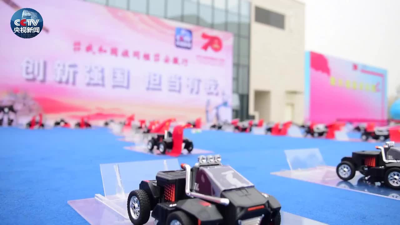 机器人手举国旗摆出70造型。