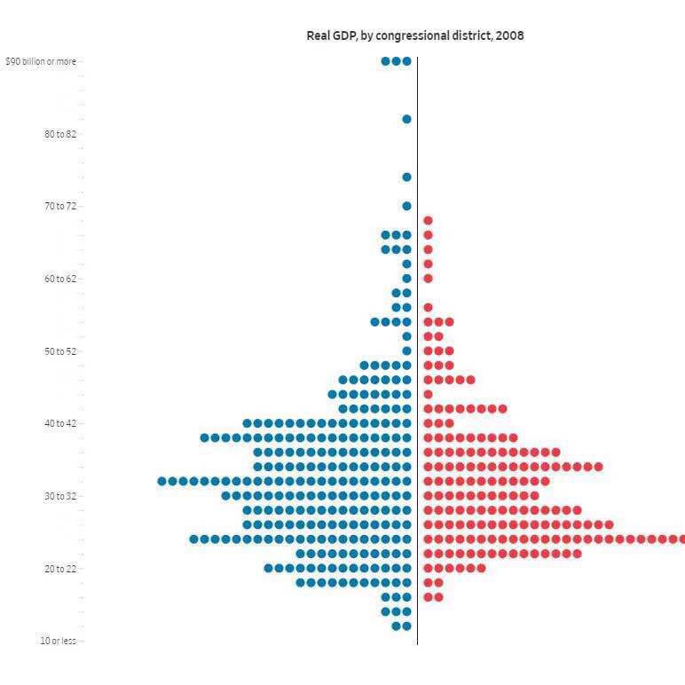 红州与蓝州——下面这两张表格显示的是美国两党国会选区2008年和2018年的真实GDP对比图。红色是共和党,蓝色为民主党。这两张图似乎可以从一个侧面解释,为何在如今的美国,不同的美国人感受到的是不同的社会现实,有着截然不同的焦虑点,对各自的未来也有着不同的期许。