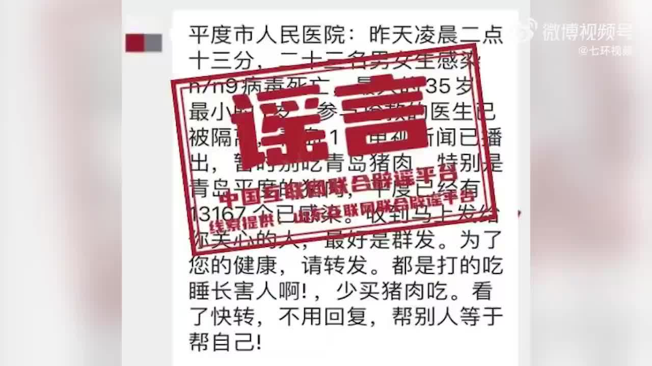 官方辟谣山东23人感染H7N9死亡:不折不扣的谣言。近日,山东。有网友以平度市人民医院名义散布“二十三人感染H7N9死亡,抢救医生被隔离”信息。平度市人民医院发布声明,这是一条不折不扣的老谣言,且已“迭代”过数次。H7N9是国家严格监控的传染性疾病,具有严格、规范的疫情上报和发布制度。谣言中编造的不实信息,对社会公众产生误导,一旦广泛传播,将会导致社会公众的恐慌,甚至有可能引发社会公共安全事件。我们严厉谴责这种不负责任的言论和行为。(via 七环视频)