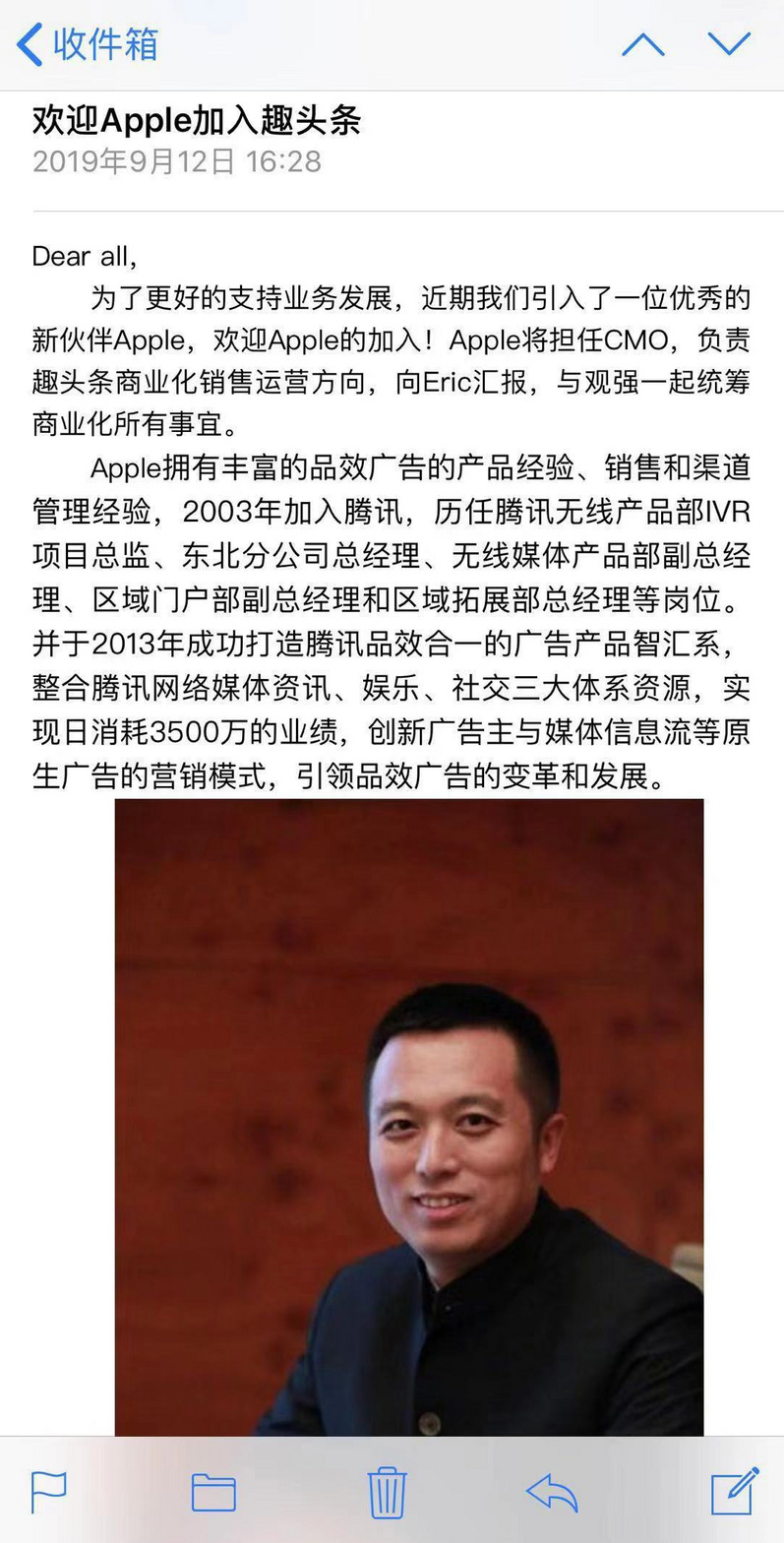 据《晚点LatePost》报道,趣头条本月迎来一位腾讯出身的CMO(首席营销官)Apple,Apple负责趣头条商业化销售运营方向。趣头条方面确认消息属实,并表示:为了更好的支持业务发展,近期趣头条引入了一位优秀的新伙伴Apple,Apple将担任CMO,负责趣头条商业化销售运营方向,向Eric(谭思亮)汇报。