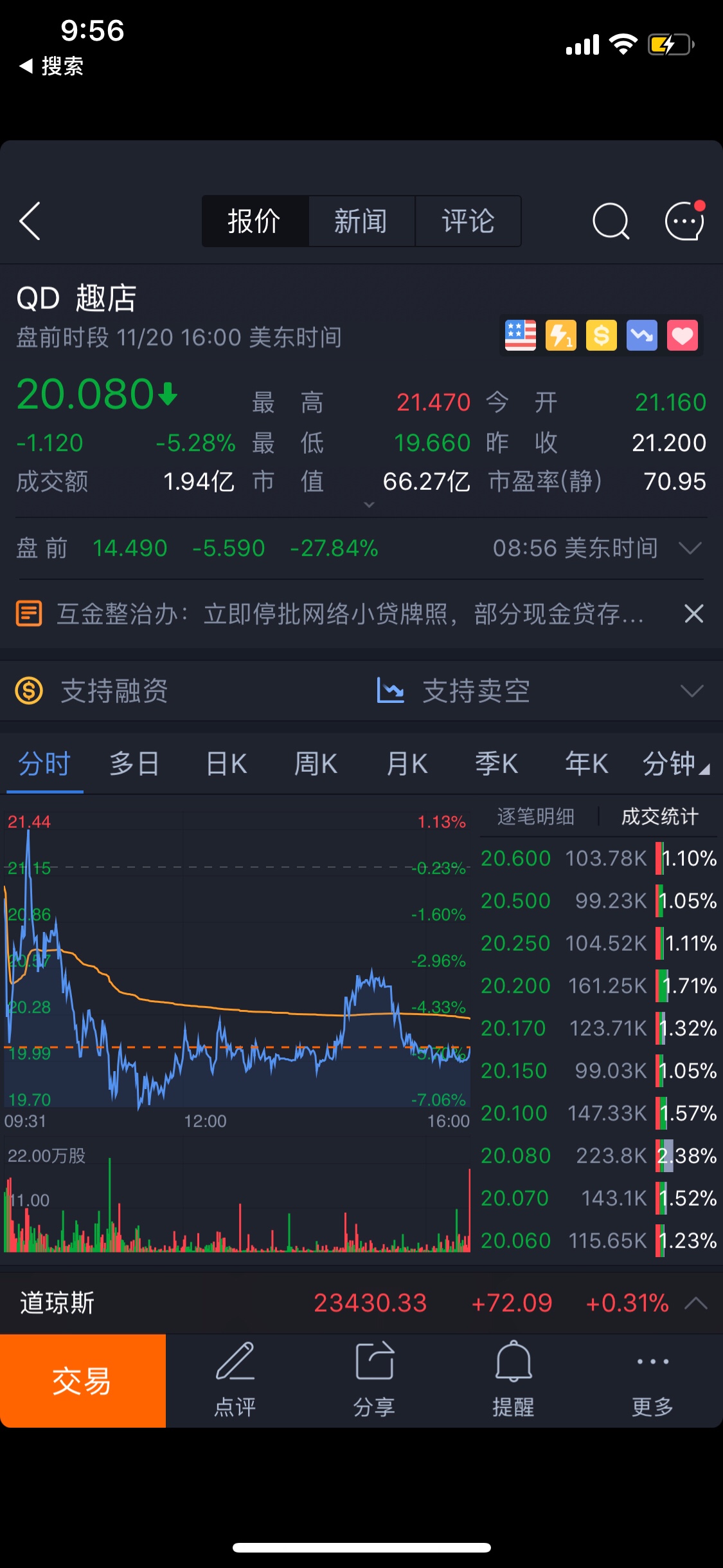 受监管政策出台影响,趣店今天盘前大跌近30%。