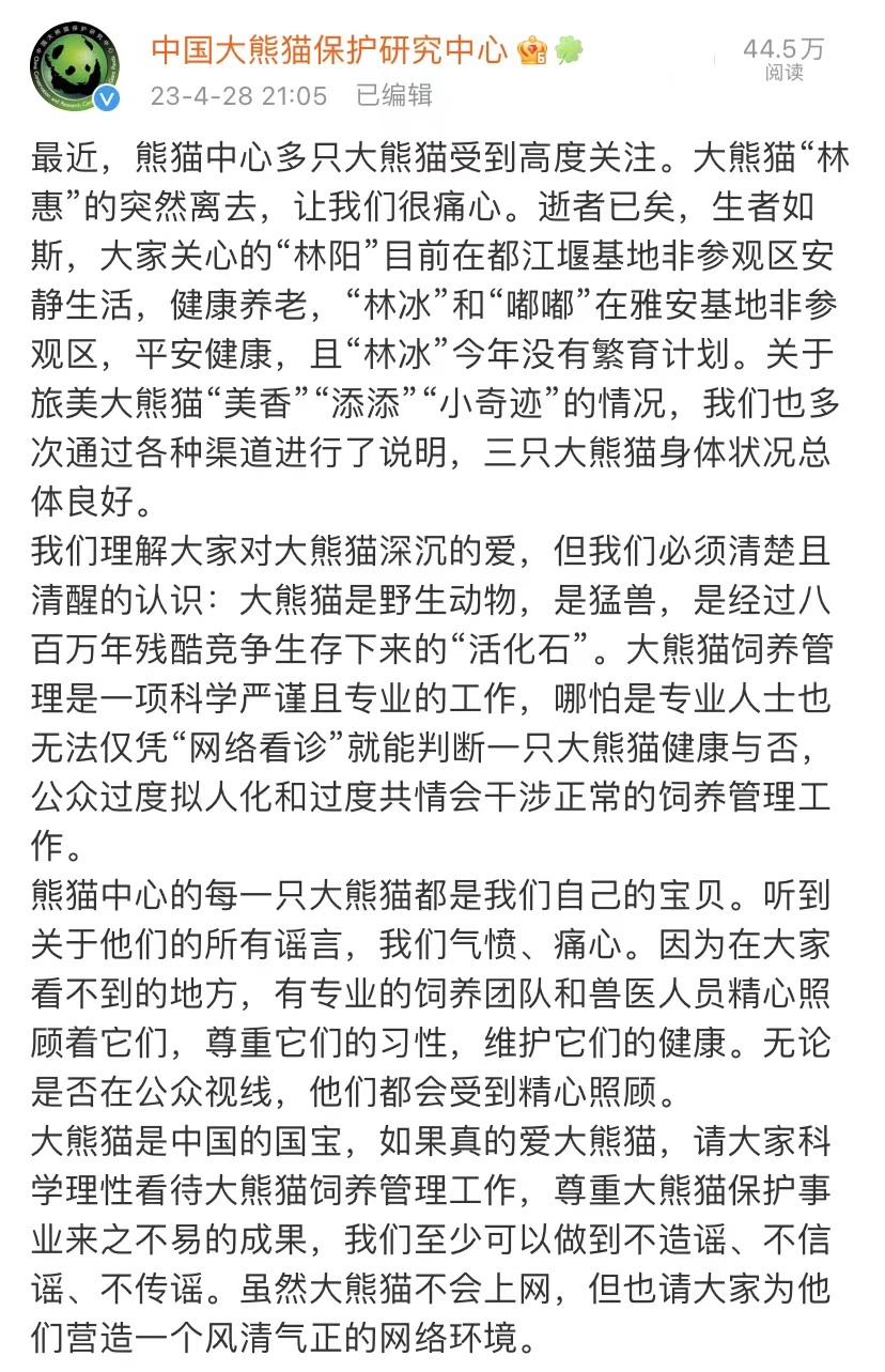 4月28日,中国大熊猫保护研究中心在其官方微博发布长文,并就多只大熊猫现状进行说明。以下为全文⬇️