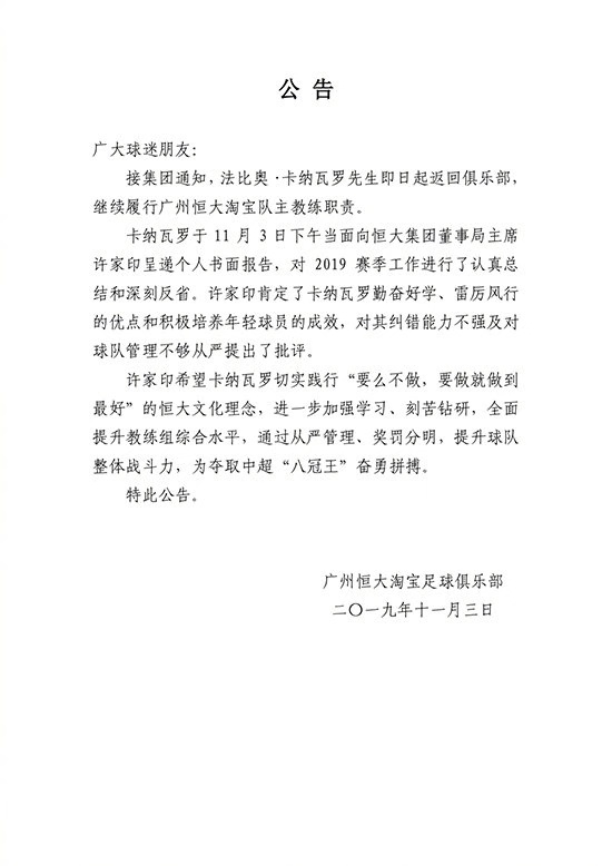 恒大官方:卡纳瓦罗进行了深刻反省,即日起继续担任球队主教练。广州恒大宣布:卡纳瓦罗即日起返回俱乐部,继续履行广州恒大淘宝队主教练职责。公告称卡纳瓦罗向许家印呈递个人书面报告,对2019赛季进行了认真总结和深刻反省。许家印肯定了卡纳瓦罗勤奋好学,雷厉风行的优点和积极培养年轻球员的成效,对其纠错能力不强和对球队管理不够提出批评。许家印希望卡纳瓦罗切实践行“要么不做,要做就做到最好”的恒大文化理念,为夺取中超“八冠王”奋勇拼搏。