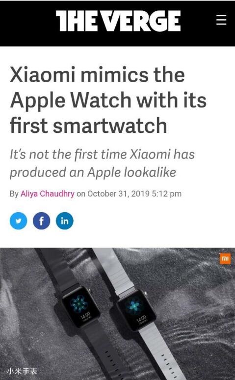 据The Verge报道,小米模仿Apple Watch推出了首款智能手表,并表示这已经不是小米第一次推出类似苹果产品的新设备了。报道中称,此前小米在微博公布的小米手表与苹果公司的Apple Watch“惊人的相似”,小米手表有着与Apple Watch几乎一样的矩阵圆角显示屏和一个可旋转的圆形按钮,尽管两者存在差异,但是还是很容易让人搞混,以为佩戴的是Apple Watch。The Verge还表示,这似乎不是小米第一次抄袭苹果,也可能不是最后一次。