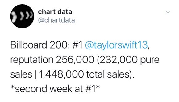 泰勒·斯威夫特新专辑《Reputation》次周连冠Billboard 200榜首