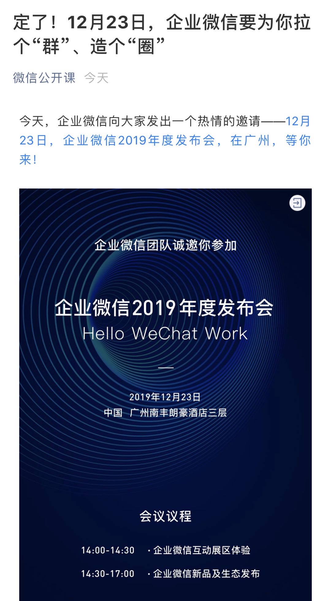 企业微信宣布将于12月23日举行2019年度发布会。企业微信表示,这次要拉个“群”、建个“圈”。此前据爆料称,企业微信或将在年前部署两个重要的版本更新,带来两个核心的功能变化:一是企业微信群容量将再次扩大,包含微信用户的外部群人数上限增加至100人(此前外部群人数上限为20人);二是企业微信将首次支持企业在微信中发布朋友圈。