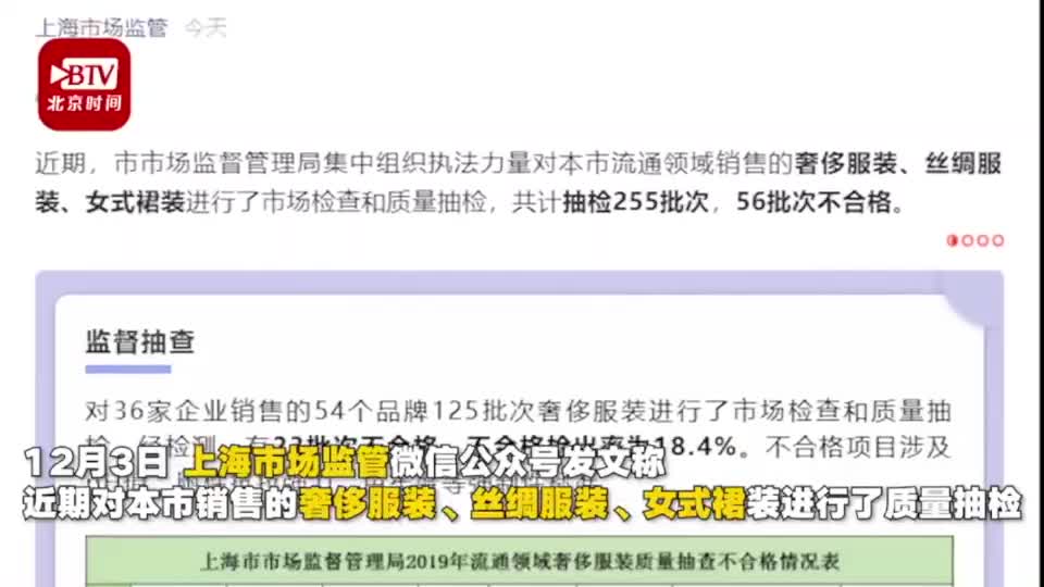 12月3日,上海市场监管微信发文称近期对本市奢侈服装、丝绸服装、女式裙装进行了质量抽检,56批次服装不合格。其中,Coach、Tory Burch、DKNY、Boy London等知名品牌在列。不合格项目涉及pH值、附件抗拉强力、色牢度等强制性标准。